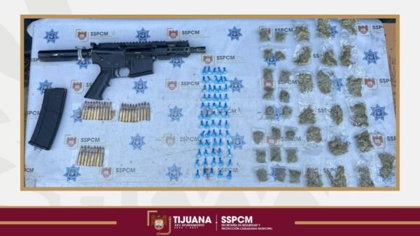 Tijuana, B. C., a 11 de agosto de 2025. Elementos de la Policía Municipal de Tijuana, en coordinación con la Secretaría de Seguridad y Protección Ciudadana, Guardia Nacional y Fuerza Estatal de Seguridad Ciudadana (FESC), aseguraron a tres hombres, dos de ellos menores de edad, en posesión de un arma de fuego y diversos envoltorios con sustancias ilícitas.